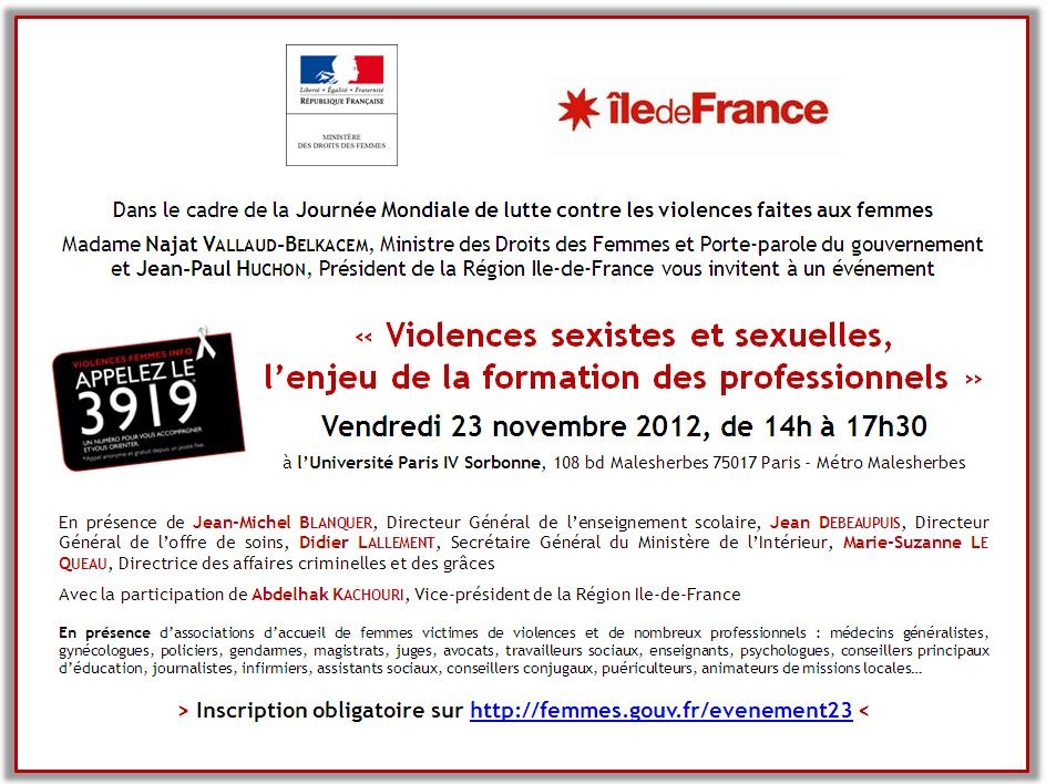 A loccasion de la Journée mondiale contre les violences faites aux femmes, le Ministère des droits des femmes est à linitiative de lorganisation dun événement axé sur la formation des professionnels travaillant auprès des femmes victimes de violences.